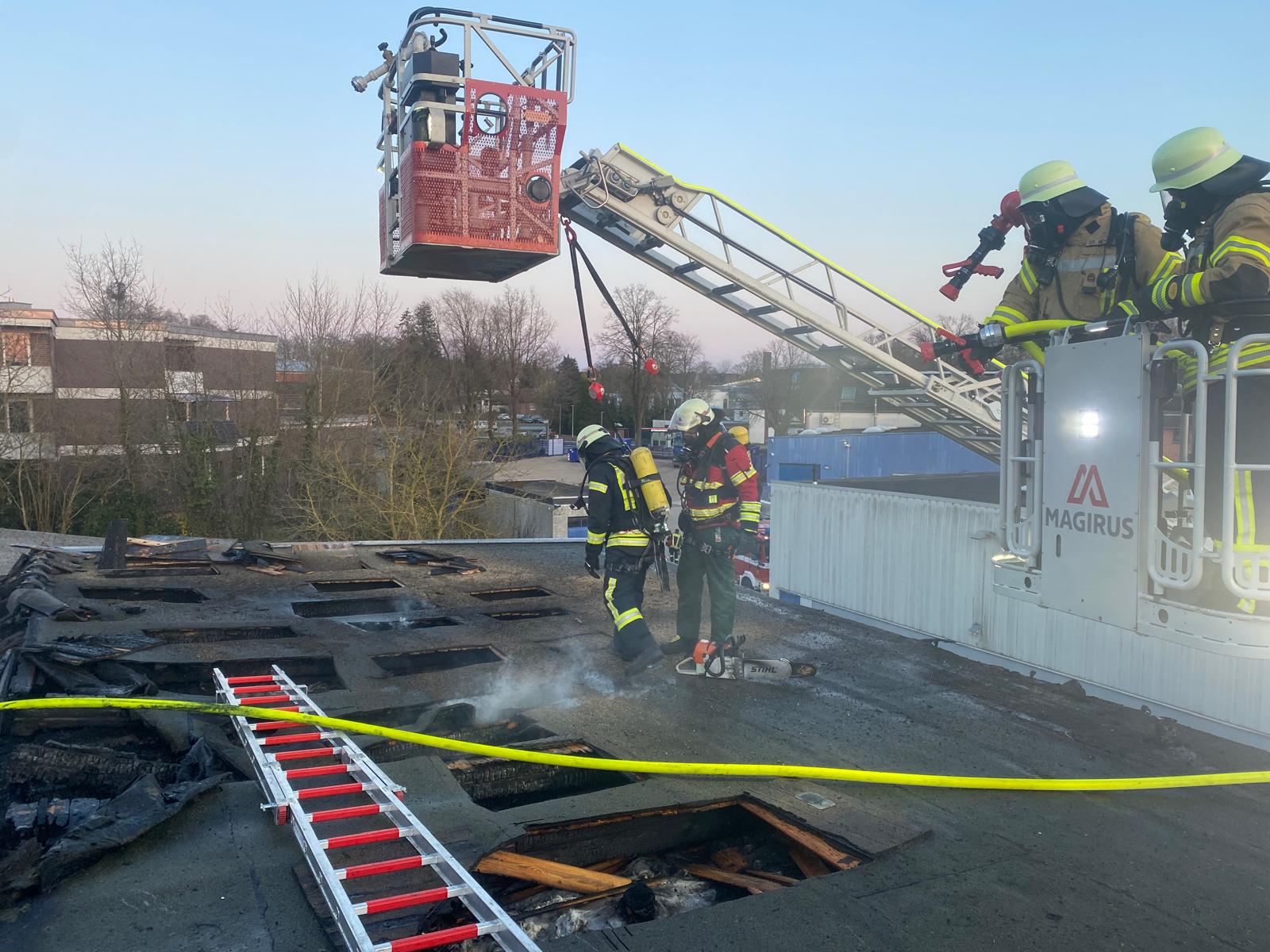Neben der Feuerwehr waren auch Polizei und Rettungsdienst vor Ort. Das Ordnungsamt kümmerte sich um die Bereitstellung von Übergangsquartieren für die Bewohner. Insgesamt waren etwa 100 Einsatzkräfte beteiligt.